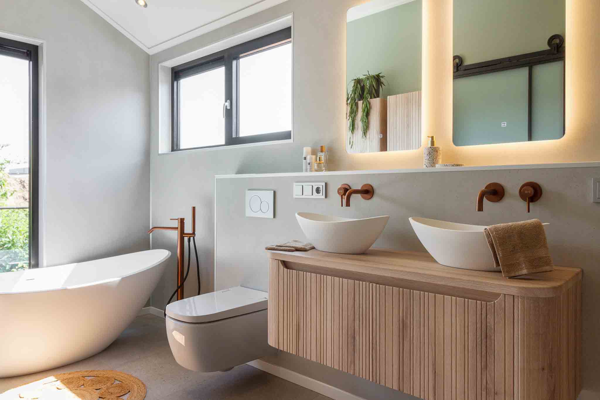 De badkamer van de Next Level 2.0 mantelzorgwoning is ruim en modern, voorzien van een grote inloopdouche met antislip vloer en een luxe regendouche. Het luxe badmeubel heeft dubbele opzetkommen en er zijn twee hoge opbergkasten voor voldoende opbergruimte. Optioneel kan een sunshower in de inloopdouche worden ingebouwd en een designbad met vloerkraan worden geplaatst voor extra comfort en luxe.