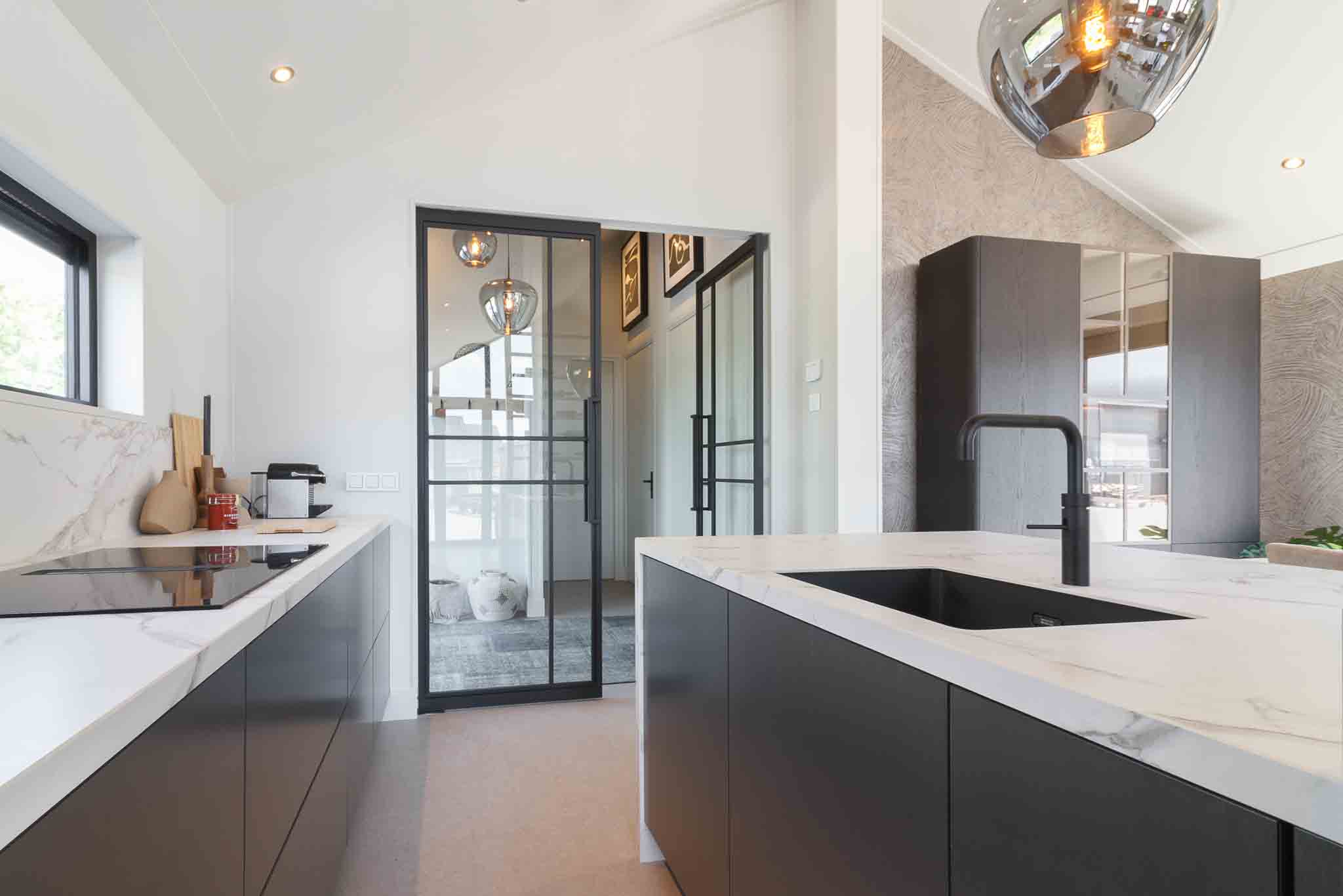Het samenspel van het hoge plafond en de grote raampartijen maakt de Next Level 2.0 tot een uitzonderlijke mantelzorgwoning. Het hoge plafond creëert een visueel indrukwekkende ruimte, terwijl de grote raampartijen zorgen voor overvloedig natuurlijk licht in de woning. Dit versterkt niet alleen de schoonheid van de ruimte, maar heeft ook een positieve invloed op het welzijn van de bewoners. De lichtinval draagt bij aan een warme en uitnodigende sfeer, waardoor de woning aanvoelt als een echte thuisbasis.